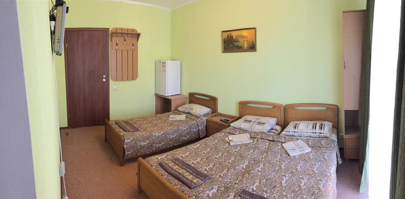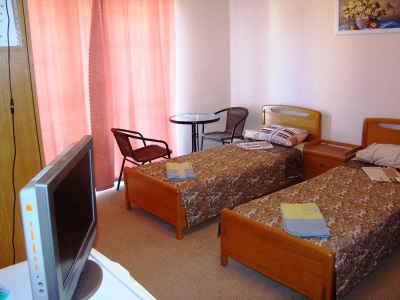 Оснащение:однокомнатный номер с балконом или с выходом на террасу. В номере: 2-х спальная кровать или две односпальные кровати (постельное белье) и одна односпальная кровать, душ, туалет, телевизор (спутниковое ТВ), кондиционер, холодильник, тумбочки, шкаф, доп. место - еврораскадушка (4-й человек). Возможность размещения 4 -го человека на доп.месте (под запрос).