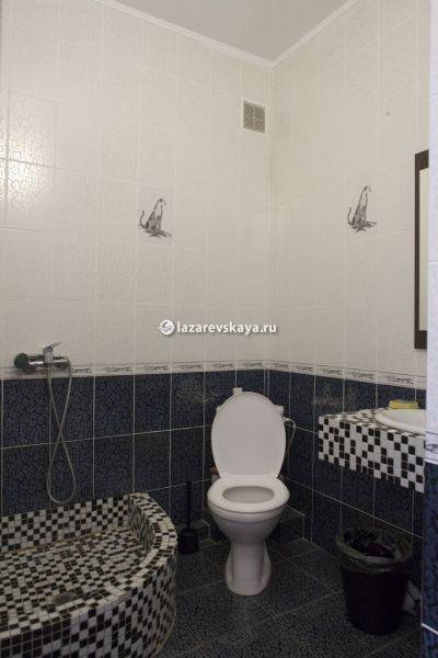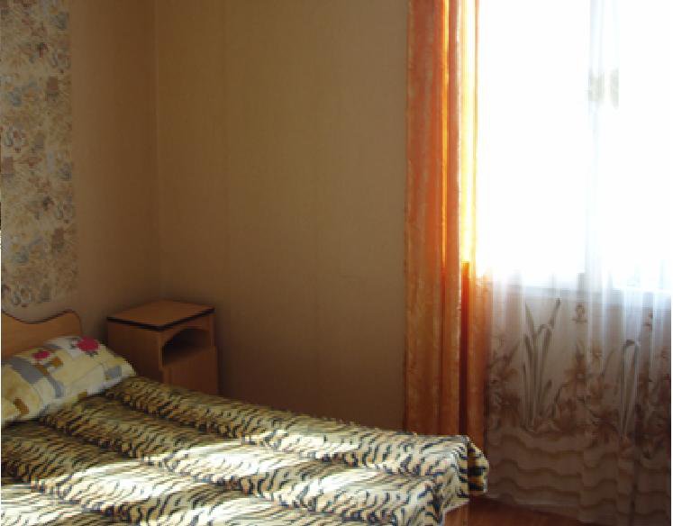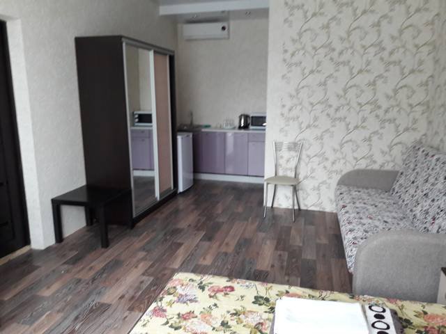 Оснащение: ТВ, холодильник, тумбочки, двуспальная кровать и диван, шкаф, зеркало, столик, стулья, душ, санузел, кондиционер. Второй этаж отдельно стоящего здания, вход в номер по внешней лестнице.