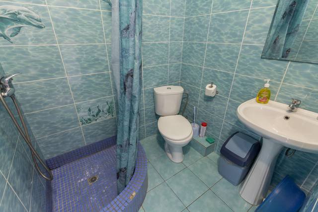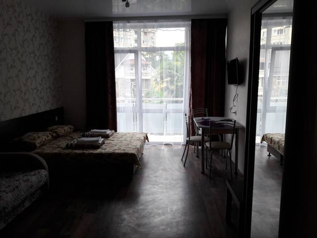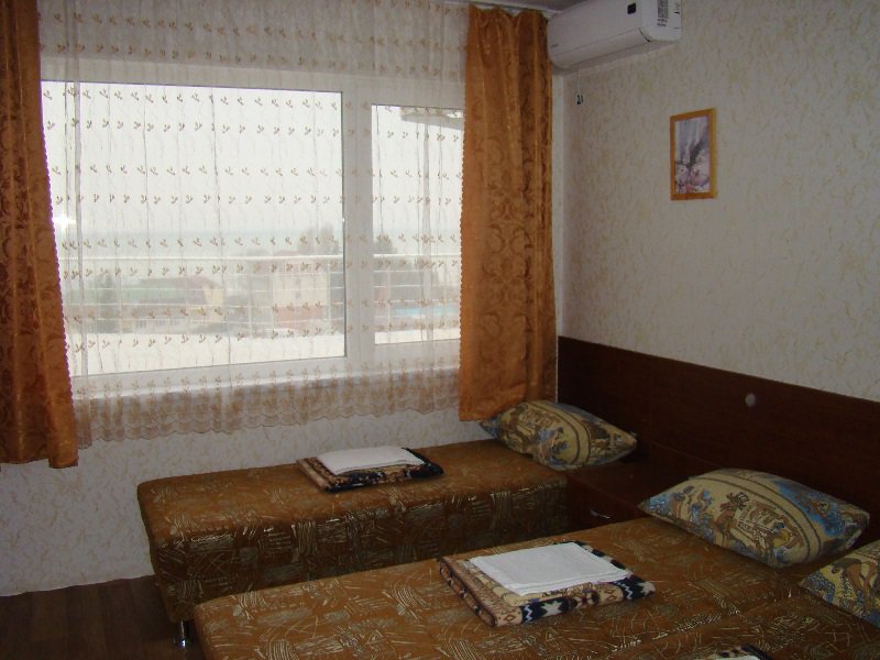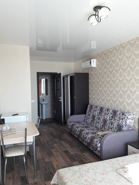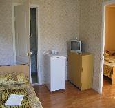 Оснащение: ТВ, холодильник, тумбочки, двуспальная и односпальная кровати гостиничного типа, шкаф, зеркало, столик, стулья, душ, санузел, кондиционер. выход на ОБЩУЮ террасу. Вид на море.