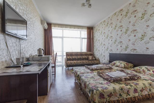 Оснащение: ТВ, холодильник, тумбочки, двуспальная и односпальная кровать гостиничного типа, двуспальный диван, шкаф, зеркало, столик, стулья, мини-кухня в номере (микроволновка, чайник, раковина), душ, санузел, кондиционер, балкон. Вид в сторону моря.